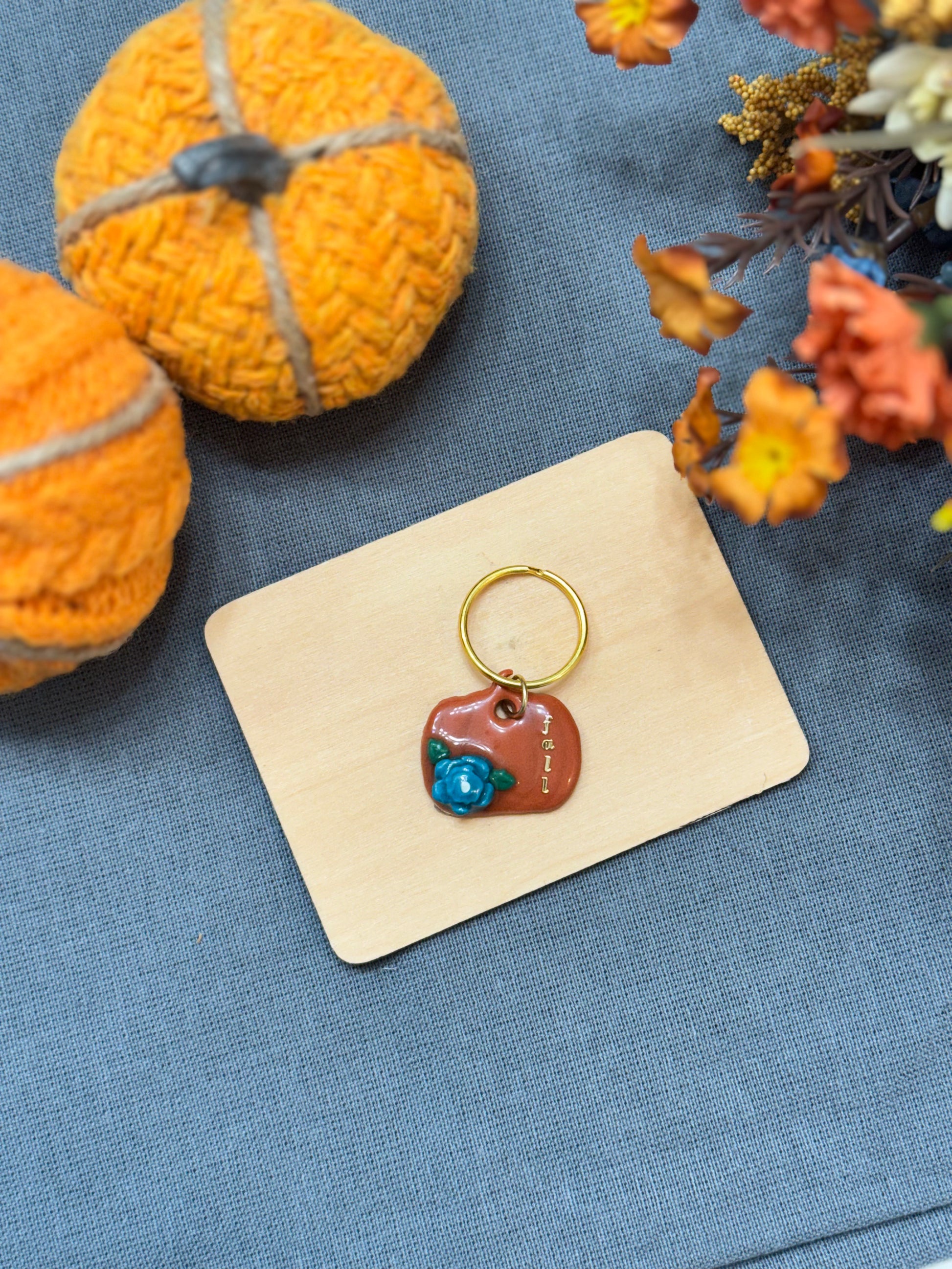 Small pet tag is a clay and resin dog tag with gold or silver hardware.