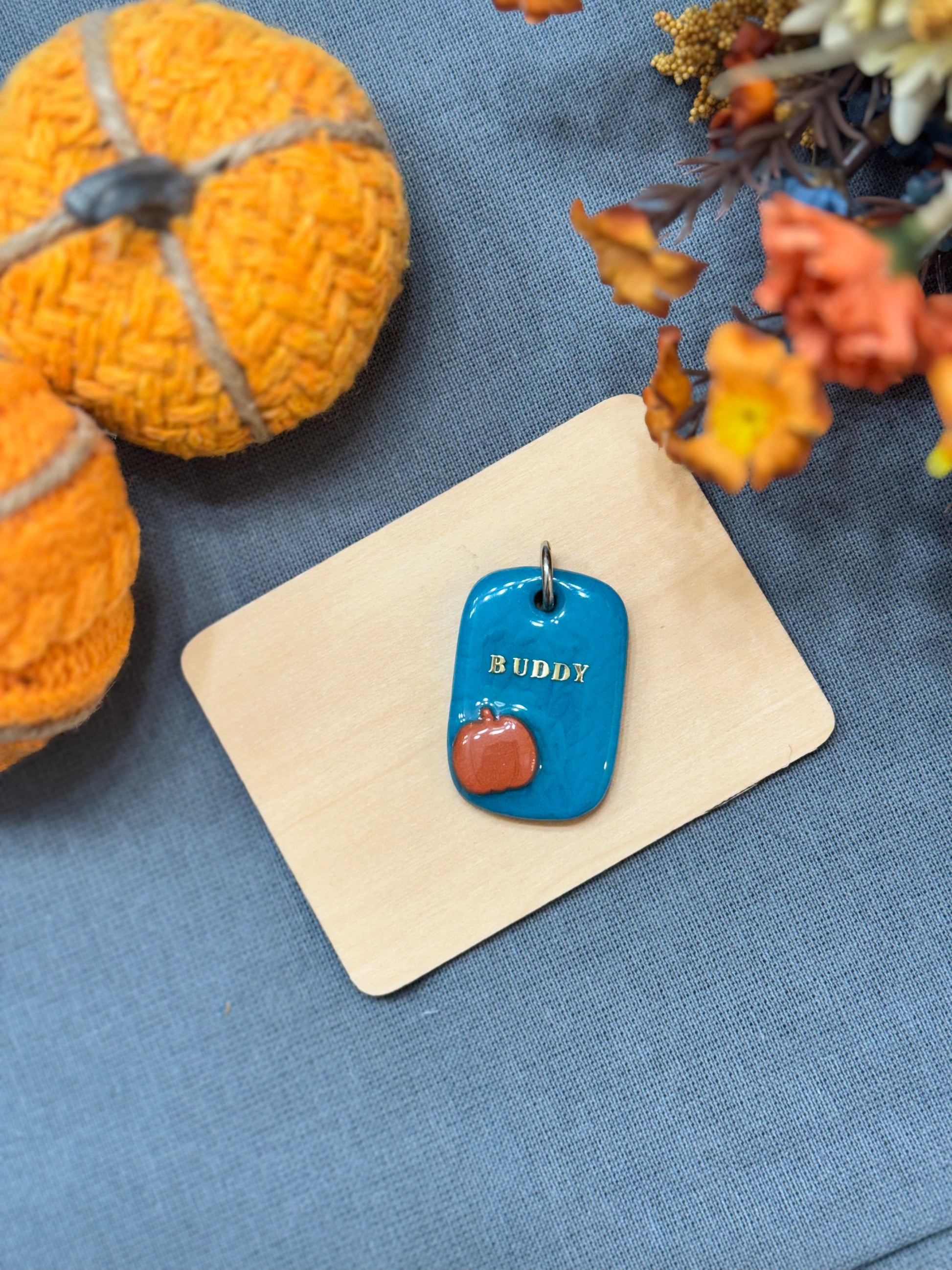 Pet tag is a clay and resin dog tag with gold or silver hardware.