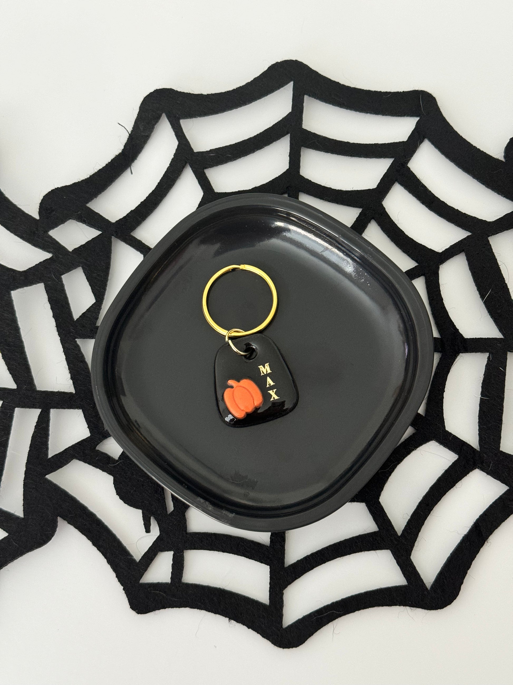 Pumpkin pet tag is a clay and resin dog tag with gold hardware.